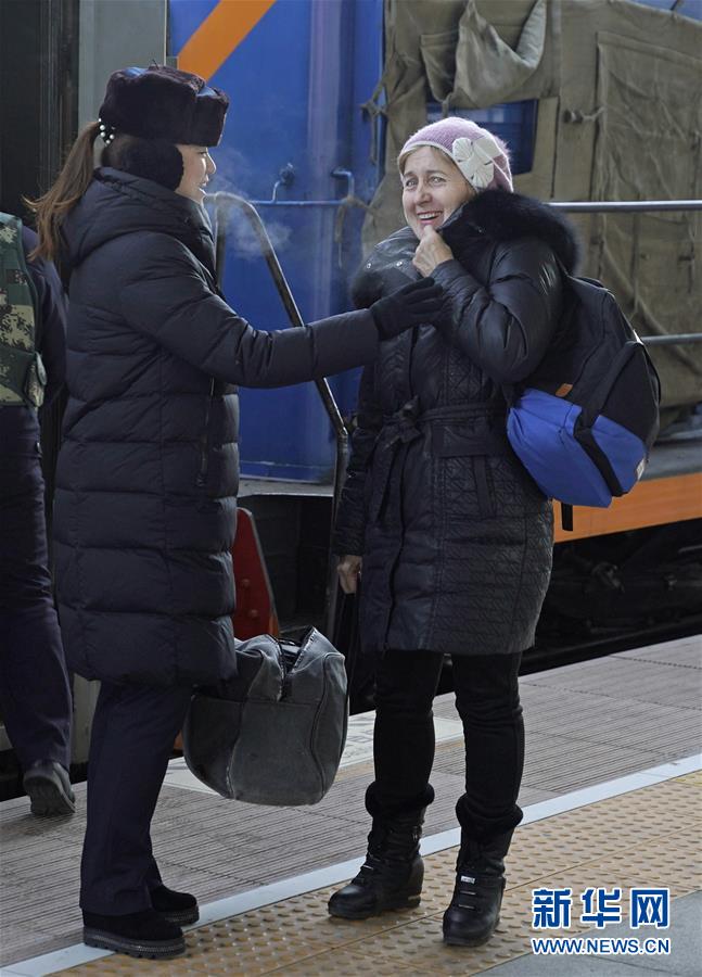 1月11日,在滿洲里火車站站臺,“金鑰匙”服務臺客運員協助外籍旅客乘車。