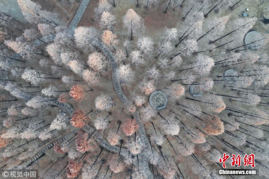 1月13日,霧散日升。河北省邢臺市大街小巷的樹枝上掛滿了潔白晶瑩的霜花,藍(lán)天下微風(fēng)吹拂銀絲閃爍,奇麗壯觀。給臘八節(jié)日增添了亮麗的風(fēng)景?;艏t軍 攝 圖片來源:視覺中國