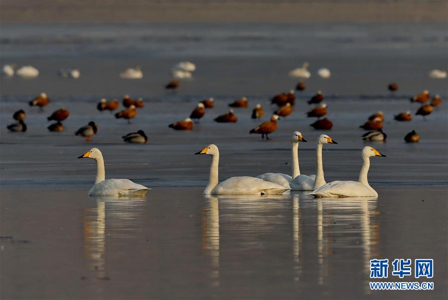 1月13日,天鵝等水鳥(niǎo)在張家口市宣化區(qū)洋河水庫(kù)休憩。 近年來(lái),河北省張家口市宣化區(qū)立足京津冀生態(tài)涵養(yǎng)區(qū)的功能定位,不斷加大環(huán)境治理和生態(tài)功能修復(fù)力度,使洋河水庫(kù)及周邊濕地成為天鵝、大雁、野鴨、灰鶴等多種鳥(niǎo)類南北遷徙中的棲息地。 新華社記者楊世堯攝