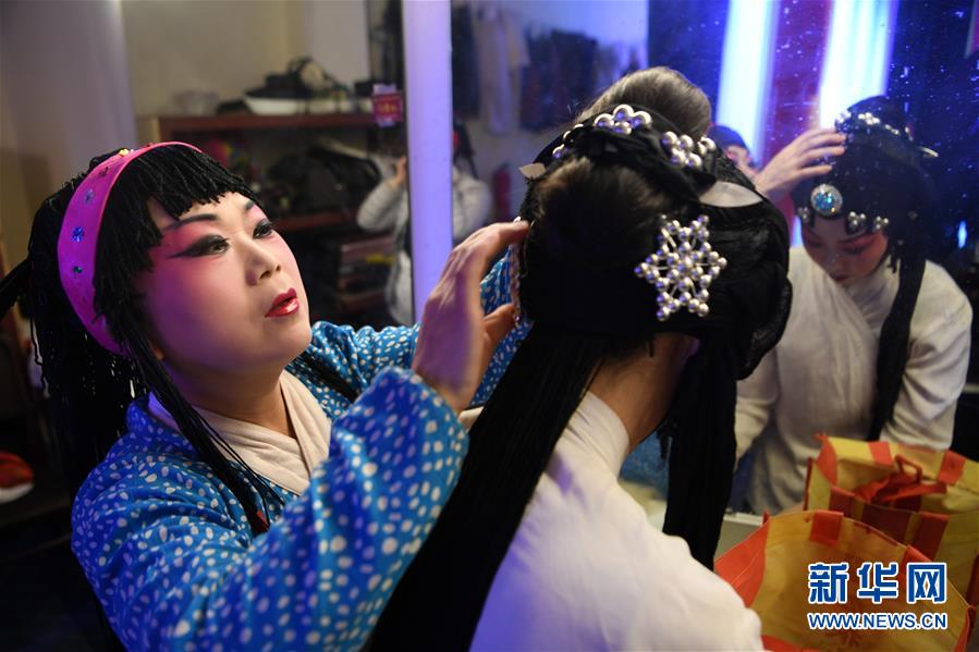 1月14日,在頤融堂戲曲體驗(yàn)館里,演員在登臺(tái)前整理發(fā)飾。新華社記者 范培珅 攝
