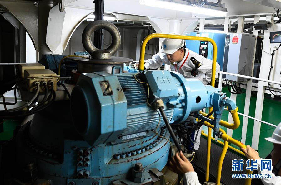 1月15日,??诤J戮止ぷ魅藛T在粵海鐵4號客滾船的機艙內(nèi)檢查舵機。