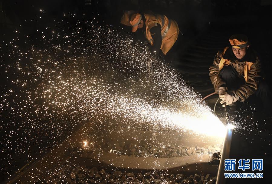 1月15日凌晨,中鐵十一局施工人員在西安站改現(xiàn)場切割鋼軌。新華社記者陶明攝