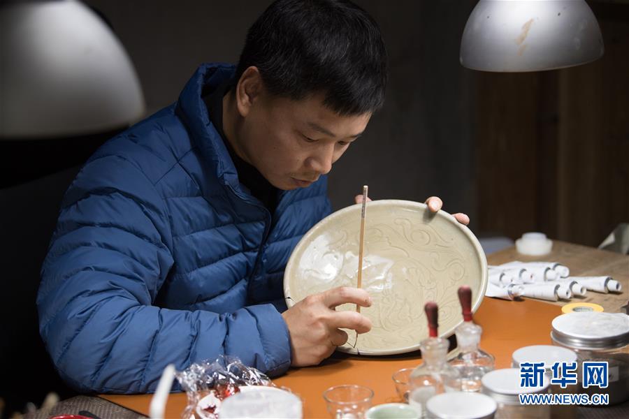 1月15日,吳榮強在龍泉市牛頭嶺村“七分醉”工作室對一件青瓷器皿進行漆繕。