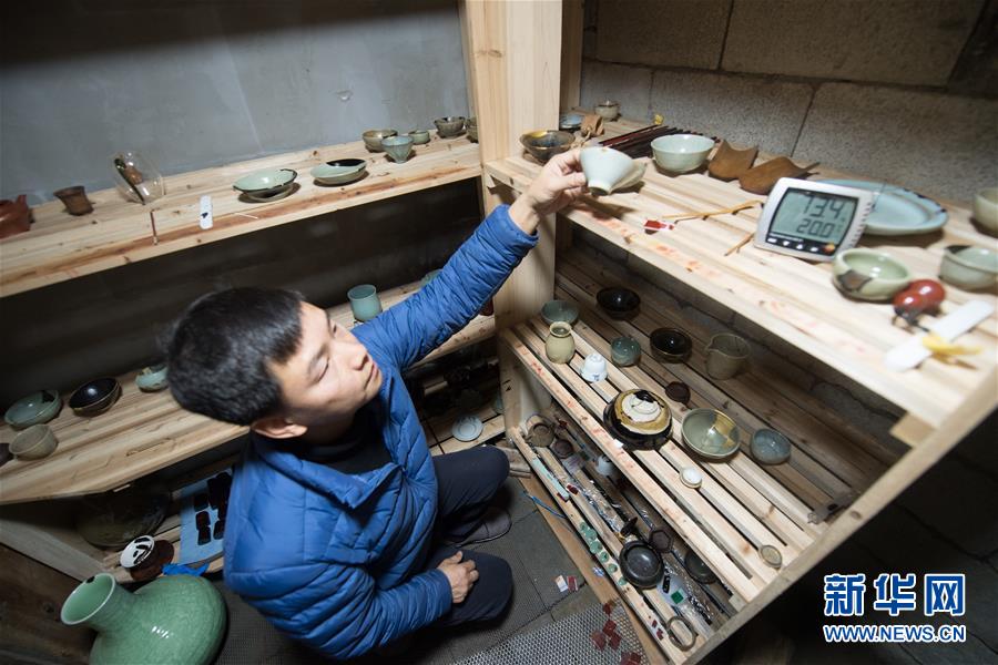 1月15日,吳榮強(qiáng)在龍泉市牛頭嶺村“七分醉”工作室蔭房?jī)?nèi)查看干燥中的漆繕器皿。新華社記者翁忻旸攝
