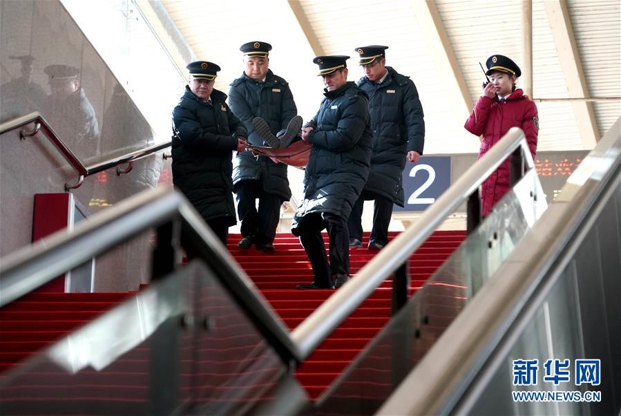 1月16日,鶴壁東站的職工在進行列車下交重傷病旅客應(yīng)急演練。 當日,中國鐵路鄭州局集團有限公司新鄉(xiāng)車務(wù)段鶴壁東站組織職工開展服務(wù)禮儀、手語等業(yè)務(wù)培訓,并進行非正常情況應(yīng)急演練,為2019年春運做準備。 新華社記者李安攝