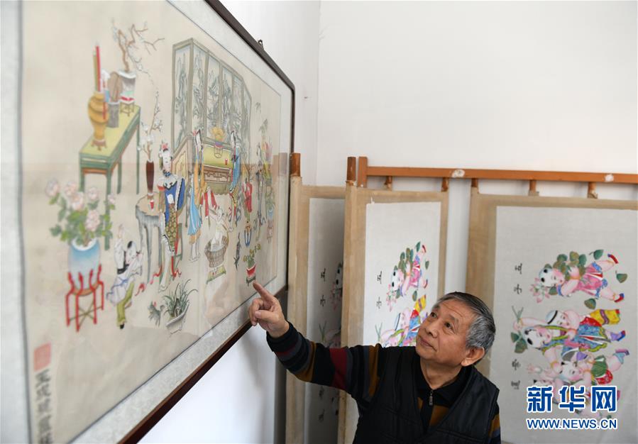 1月16日,霍慶順在介紹一幅裝裱好的楊柳青年畫。