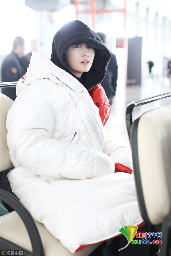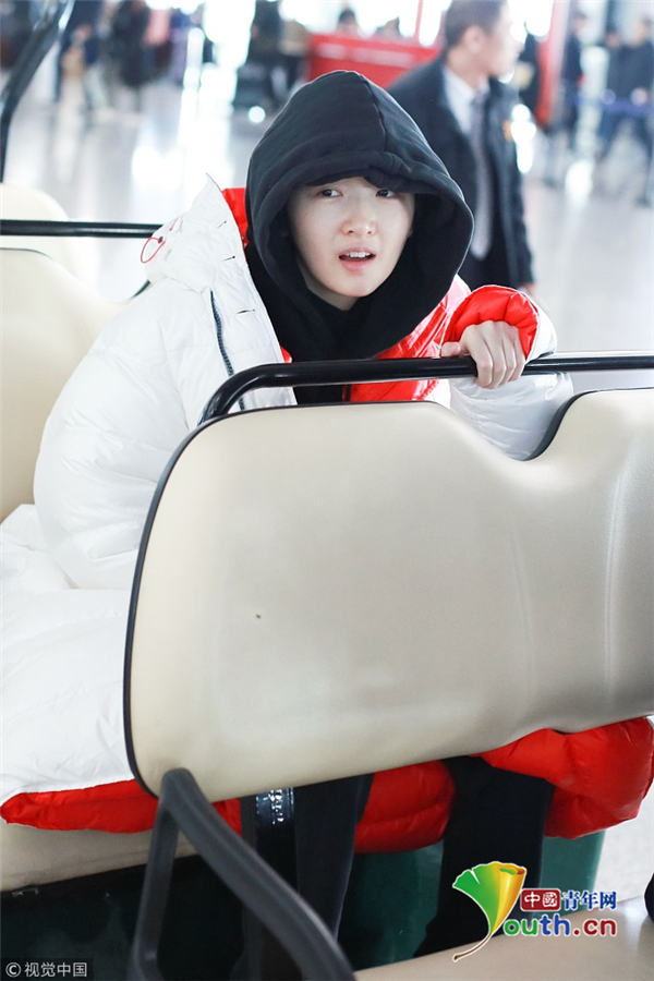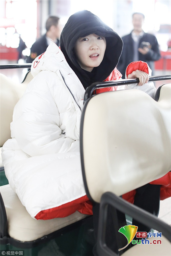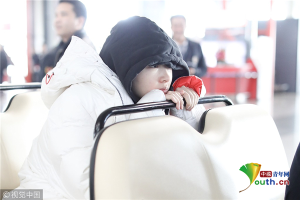 1月23日,北京,周冬雨現(xiàn)身機(jī)場(chǎng)。她用黑色連衣帽罩頭襯托巴掌臉,把下巴擱在行李車推桿上的雙手上呆萌可愛 。