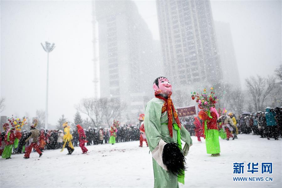 2月16日,社火隊(duì)演員在青海省大通回族土族自治縣文化廣場(chǎng)表演。