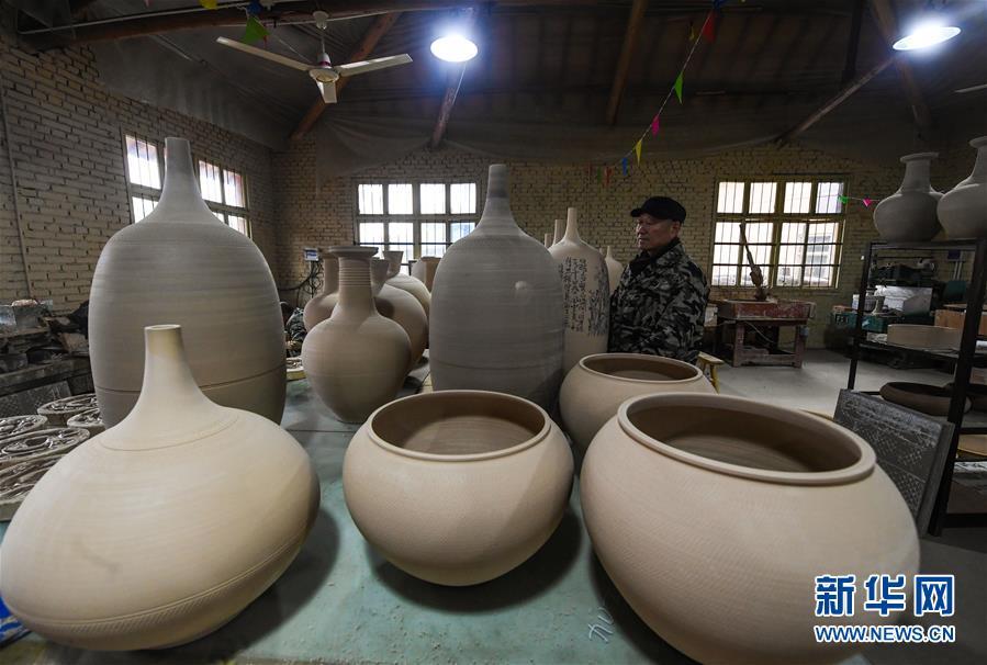 2月16日,陳新華在工作室中查看準(zhǔn)備進(jìn)行燒制的素坯。新華社記者 徐昱 攝