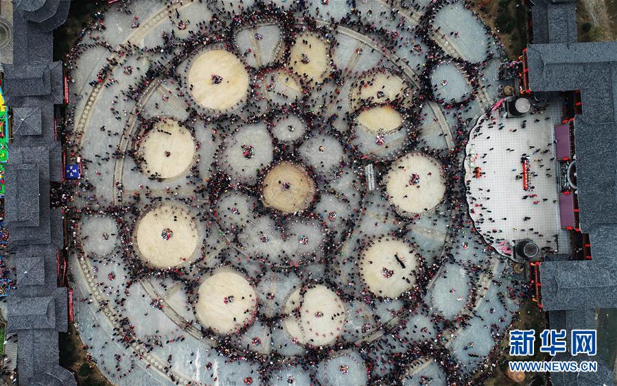 2月24日,在貴州省凱里市舟溪鎮(zhèn),苗族群眾在跳蘆笙舞(無人機(jī)拍攝)。 當(dāng)日,在貴州省黔東南苗族侗族自治州凱里市舟溪鎮(zhèn),來自各地的苗族群眾身著節(jié)日盛裝,歡聚在古老的“甘囊香”蘆笙堂,男子吹奏起蘆笙,姑娘和孩子們跳起蘆笙舞,歡度新春,祈求風(fēng)調(diào)雨順、五谷豐登,青年男女也借此良日尋覓意中人。 “甘囊香”是苗語音譯,意思為“河流的下游,神仙匯聚的地方”。“甘囊香”蘆笙會(huì)是貴州規(guī)模最大、最古樸的苗族蘆笙會(huì)之一。 新華社記者楊文斌攝