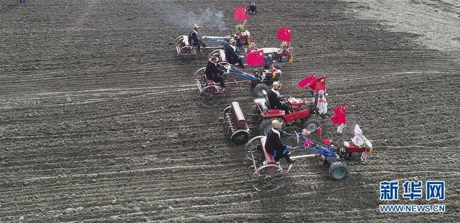 3月16日無(wú)人機(jī)拍攝的山南市乃東區(qū)克松社區(qū)開(kāi)耕儀式現(xiàn)場(chǎng)。當(dāng)日,西藏各地男女老幼身著節(jié)日盛裝,駕著一輛輛由彩旗、花朵裝扮一新的拖拉機(jī),涌向待墾的農(nóng)田,載歌載舞迎來(lái)一年一度的開(kāi)耕儀式。新華社記者 晉美多吉 攝