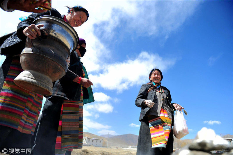 2019年3月16日,西藏各地迎來開耕節(jié)。位于年楚河畔的日喀則白朗縣被譽為“后藏糧倉”,當(dāng)日,當(dāng)?shù)夭刈遛r(nóng)牧民將家里的耕牛裝扮一新,對農(nóng)田進(jìn)行開耕,大家齊聚青稞地,慶祝春播開始。圖為白朗縣洛江鎮(zhèn)民眾在青稞地里煨桑煙(一種祈福方式)、敬獻(xiàn)青稞酒,祈福新的一年風(fēng)調(diào)雨順、五谷豐登。 江飛波(西藏分社)/中新社/視覺中國 編輯/陳進(jìn)