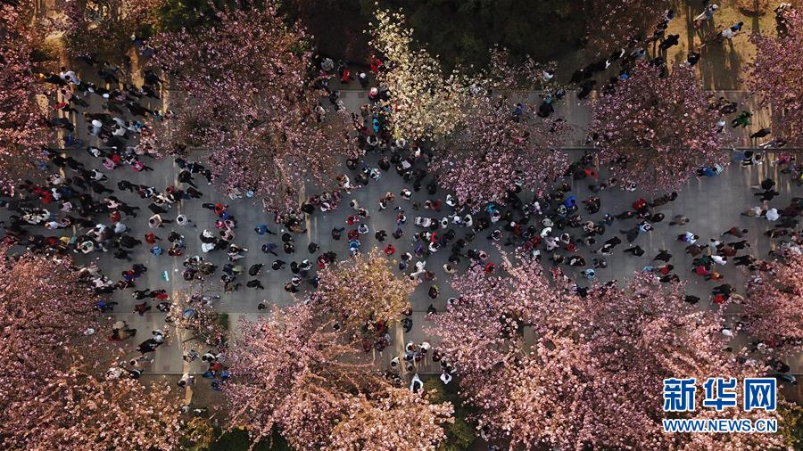 3月31日,游客在中國(guó)科學(xué)技術(shù)大學(xué)東區(qū)觀賞櫻花(無(wú)人機(jī)拍攝)。