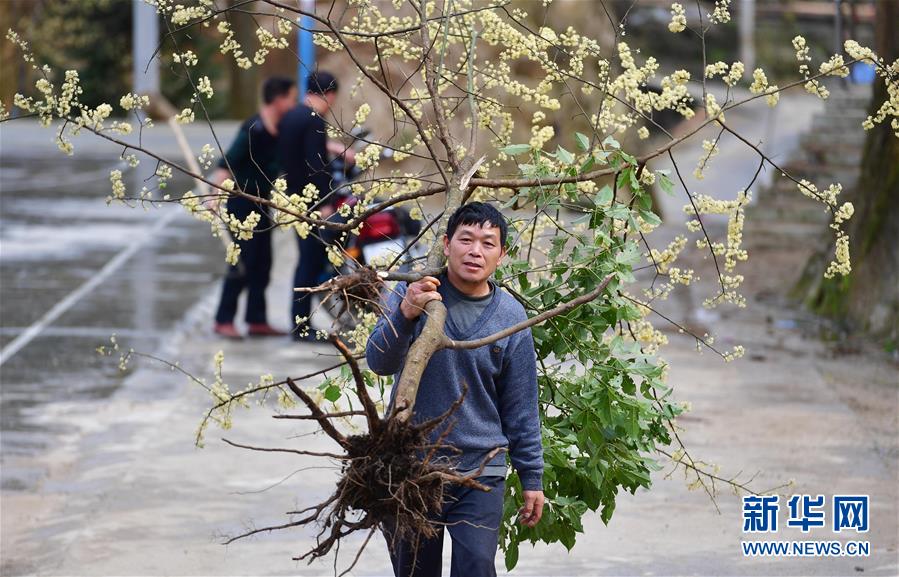 這是黔桂烏英苗寨的群眾在抬樹苗,準備用來美化居住環(huán)境(3月16日攝)。