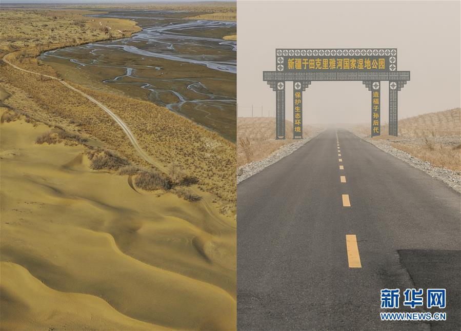 拼版照片:左圖為沿著克里雅河通向地處沙漠深處新疆于田縣達(dá)里雅布依鄉(xiāng)的路(3月19日無(wú)人機(jī)拍攝);右圖為從縣城通往達(dá)里雅布依小鎮(zhèn)易地扶貧安置點(diǎn)的柏油路(3月20日攝)。新華社記者 胡虎虎 攝