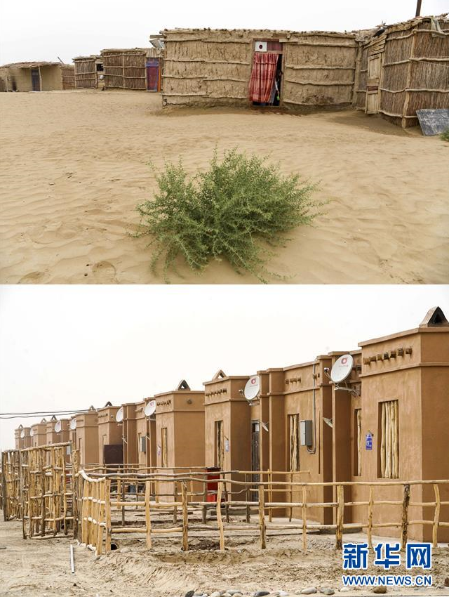 拼版照片:上圖為新疆于田縣達(dá)里雅布依鄉(xiāng)的民居(2018年9月7日攝);下圖為達(dá)里雅布依小鎮(zhèn)易地扶貧安置點(diǎn)的房屋(2019年3月20日攝)。新華社記者 胡虎虎 攝