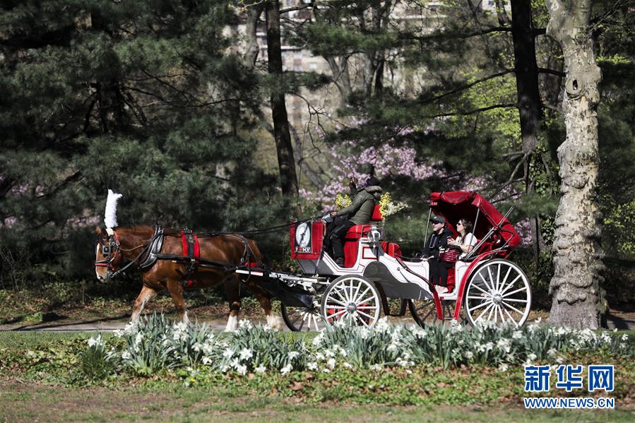 4月16日,人們?cè)诿绹~約中央公園乘坐馬車游玩。 新華社記者 王迎 攝