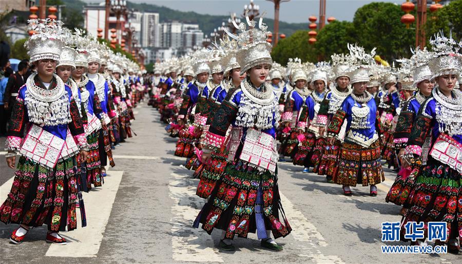 4月18日,臺江縣苗族群眾參加盛裝游演活動。 當日,貴州省黔東南苗族侗族自治州臺江縣迎來一年一度的苗族姊妹節(jié)。節(jié)日期間將舉行苗族盛裝游演、千人長桌宴、千人游方體驗、苗族手工創(chuàng)意大賽等一系列活動。 姊妹節(jié)是臺江縣苗族同胞的傳統(tǒng)節(jié)日,2006年被列入第一批國家級非物質文化遺產(chǎn)名錄。 新華社記者 楊文斌 攝
