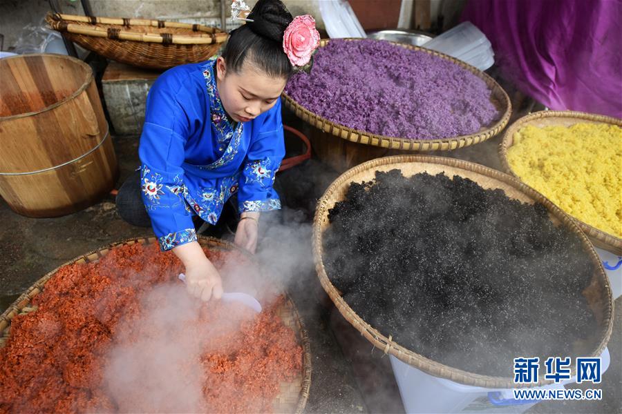 4月17日,在貴州省臺江縣姊妹街哆蝶五彩姊妹飯體驗店,苗家婦女在攤晾五彩“姊妹飯”。新華社記者 楊文斌 攝