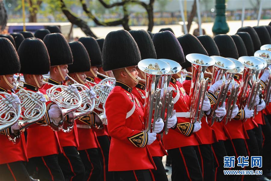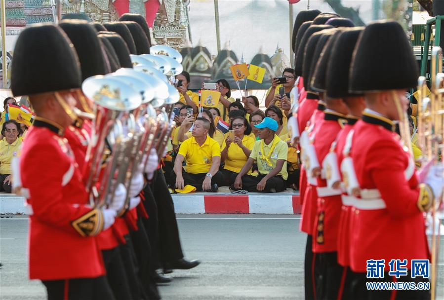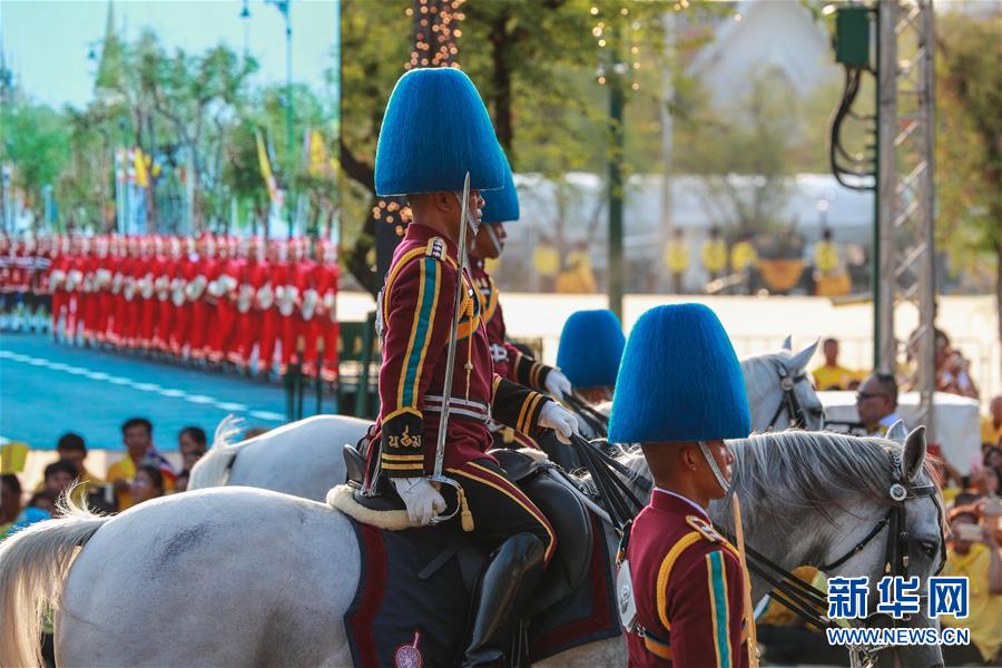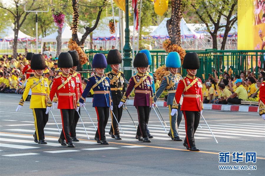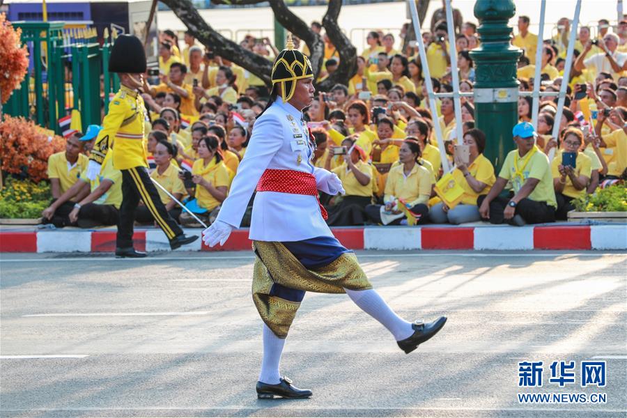5月5日,儀仗隊在曼谷大王宮附近舉行的泰國國王加冕典禮巡游上列隊前進。 新華社發(fā)(拉亨攝)