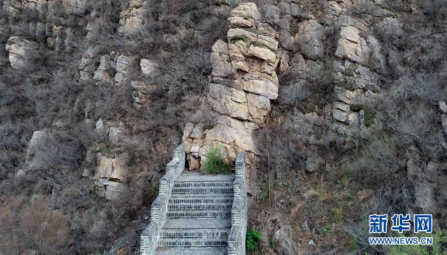 黃崖關(guān)長城東側(cè)的起點與陡峭的山崖相連(4月18日攝)。新華社記者 岳月偉 攝