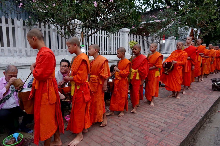 每天清晨,虔誠的佛教徒備好花塔和糯米飯,跪坐在街道兩旁,等候僧侶前來化緣,然后將糯米飯和粽子放到他們的化緣缽中,僧侶則以誦經(jīng)祈福答謝施主。
