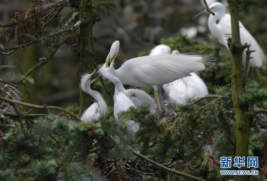 在江西省南昌市新建區(qū)象山森林公園內(nèi),白鷺和自己的雛鳥在一起(5月21日攝)。 近日,在江西省南昌市新建區(qū)象山森林公園內(nèi),已安家筑巢的大批鷺鳥陸續(xù)孵化出了后代。象山森林公園有著“鷺鳥王國”的美譽,生態(tài)環(huán)境良好,每年都會吸引白鷺、蒼鷺、夜鷺等種類的鷺鳥飛抵棲息和繁衍后代。 新華社記者 彭昭之 攝