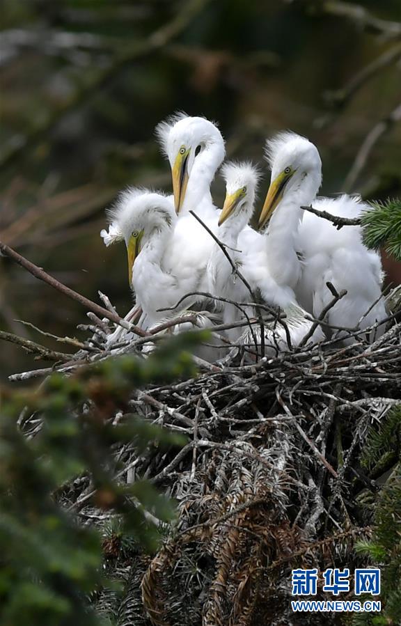江西省南昌市新建區(qū)象山森林公園內(nèi)的白鷺雛鳥(5月21日攝)。 近日,在江西省南昌市新建區(qū)象山森林公園內(nèi),已安家筑巢的大批鷺鳥陸續(xù)孵化出了后代。象山森林公園有著“鷺鳥王國”的美譽,生態(tài)環(huán)境良好,每年都會吸引白鷺、蒼鷺、夜鷺等種類的鷺鳥飛抵棲息和繁衍后代。 新華社記者 彭昭之 攝