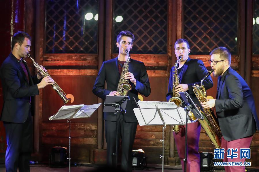5月26日,凱比亞特樂隊(duì)成員在音樂會(huì)上表演。 當(dāng)日,作為第十九屆“相約北京”藝術(shù)節(jié)系列演出之一,西班牙凱比亞特樂隊(duì)薩克斯四重奏音樂會(huì)在北京Temple東景緣上演。 新華社記者 張玉薇 攝