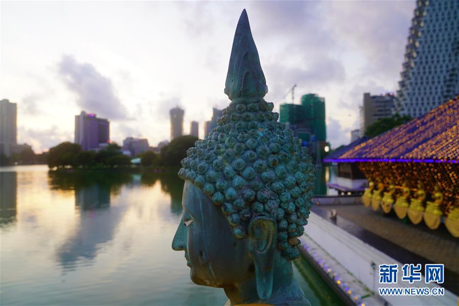 這是夕陽(yáng)下的斯里蘭卡科倫坡水中廟佛像(5月27日攝)。 在科倫坡貝拉湖上有一座木造樓閣——水中廟。木造建筑上面覆蓋著藍(lán)瓦,外圍環(huán)繞著線條優(yōu)美的佛像。樓閣外高臺(tái)上供奉的佛像,與不遠(yuǎn)處的高層建筑相互映照。祥和寧?kù)o的水中廟已成為人們修心、祈福的重要場(chǎng)所。 新華社記者唐璐攝