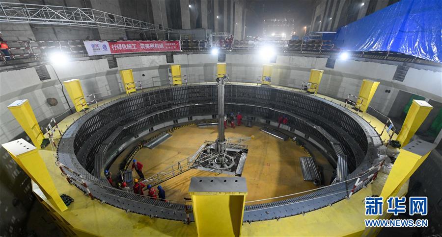 烏東德水電站左岸地下電站主廠房內(nèi)的6號機組正在建設中(5月30日攝)。 新華社記者陳曄華攝