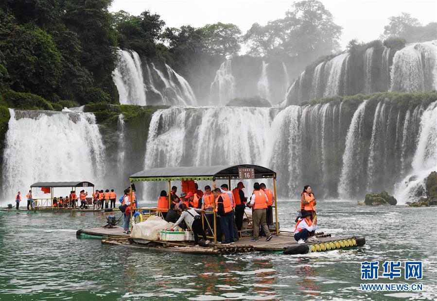 4月17日,游客乘坐竹筏在大新縣德天瀑布景區(qū)游覽。