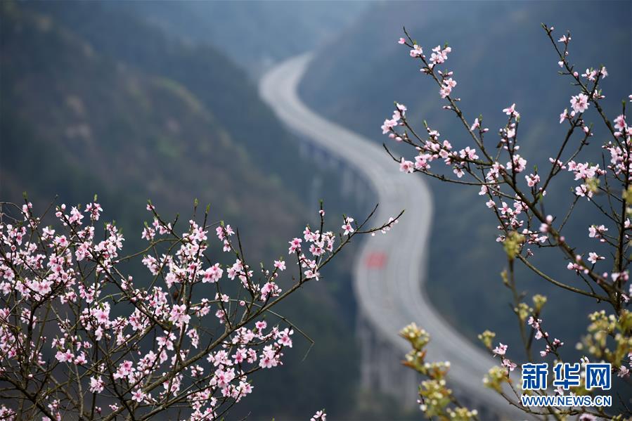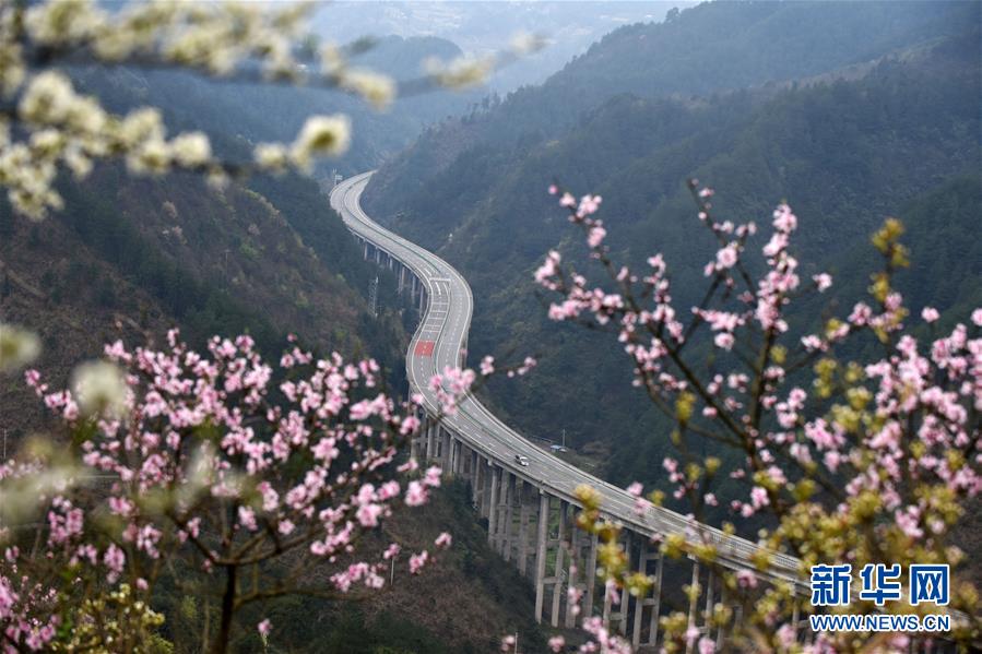 貴州思劍高速公路劍河縣岑松鎮(zhèn)段的春季景觀(3月23日攝)。陽春時節(jié),貴州思(南)劍(河)高速公路劍河縣岑松附近的桃花和梨花陸續(xù)開放。 新華社記者楊文斌攝