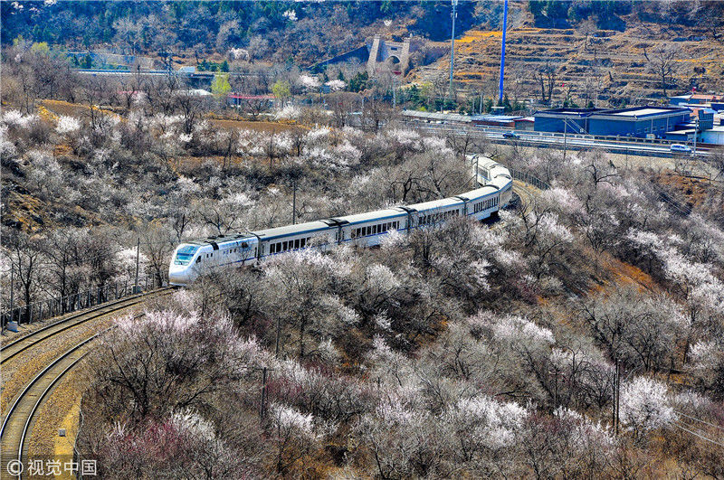 2019年3月22日,北京居庸關附近的山花盛開,S2線列車穿行在花海之中,構成一幅美麗的畫面。時永平/千龍圖像/視覺中國 編輯/陳進