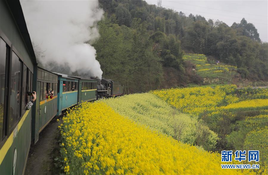 3月20日,一列嘉陽小火車在油菜花叢中穿行。