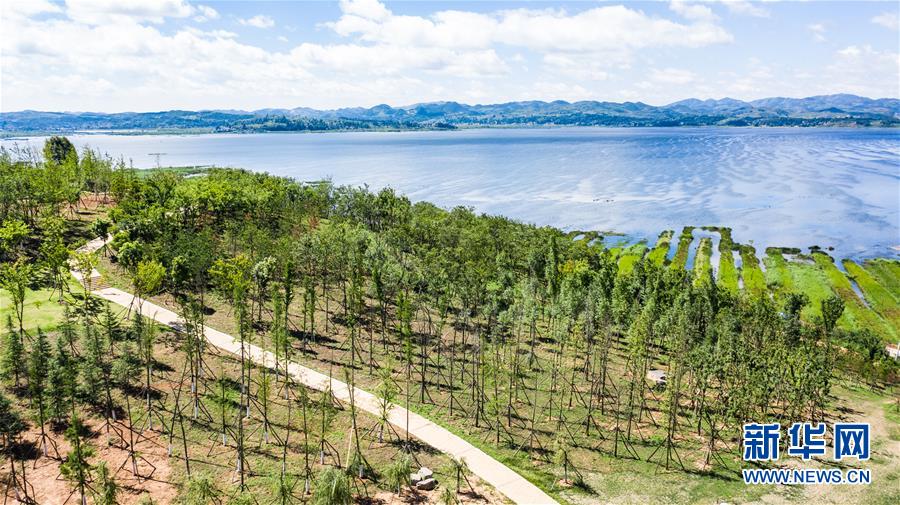 6月20日無人機拍攝的草海國家級自然保護區(qū)造林涵湖工程一隅。 新華社記者 陶亮 攝