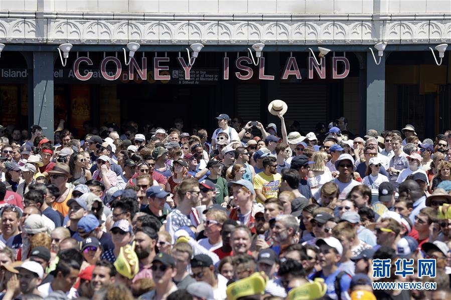 7月4日,在美國(guó)紐約康尼島,人們觀(guān)看吃熱狗大賽。新華社記者 李木子 攝