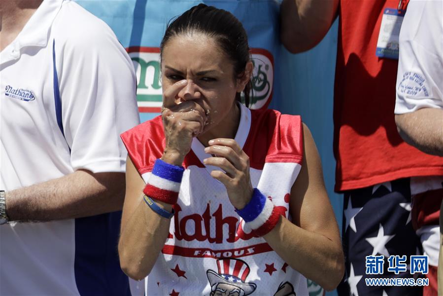 7月4日,在美國(guó)紐約康尼島,一名女選手參加吃熱狗大賽。新華社記者 李木子 攝
