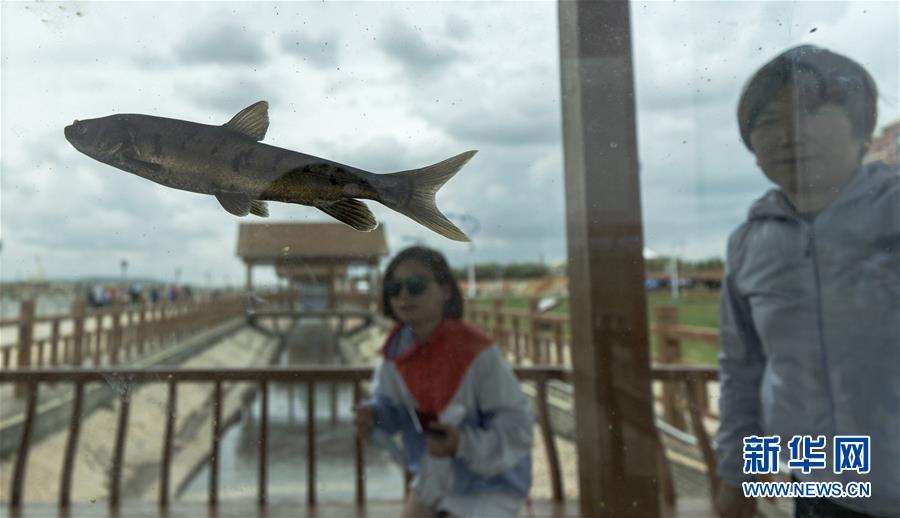 7月6日,在青海省剛察縣湟魚(yú)廣場(chǎng),兩名游客在觀賞魚(yú)缸中的湟魚(yú)。 新華社記者費(fèi)茂華攝