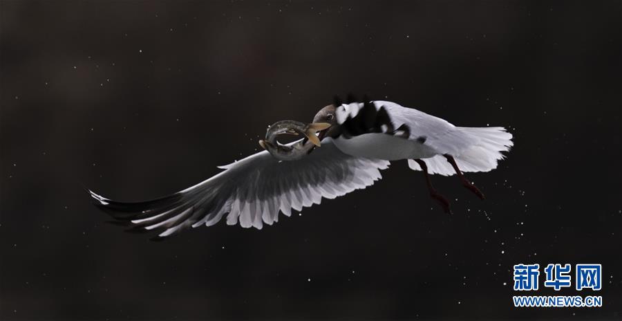 7月6日,在青海省剛察縣沙柳河,一只棕頭鷗捕捉到一只湟魚(yú)后飛離水面。 新華社記者 費(fèi)茂華攝