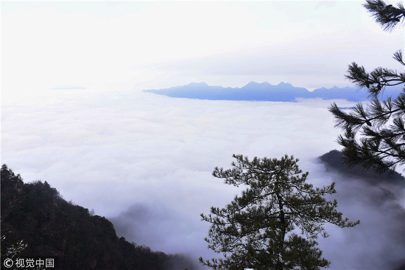 2019年3月3日,陜西商洛,位于鎮(zhèn)安縣的塔云山景區(qū)云海翻騰,宛如仙境。