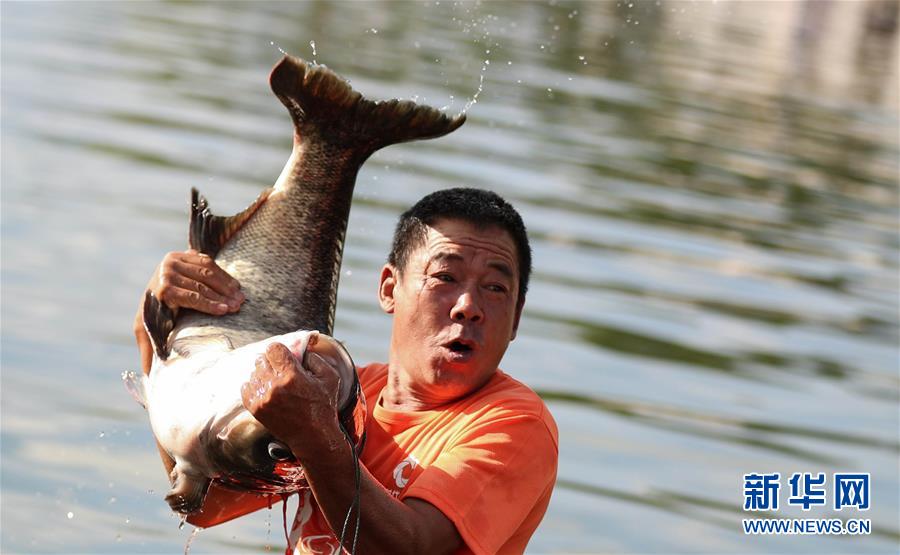 7月27日,在西昌邛海,一名漁民捕得一條大魚(yú)。新華社記者江宏景攝