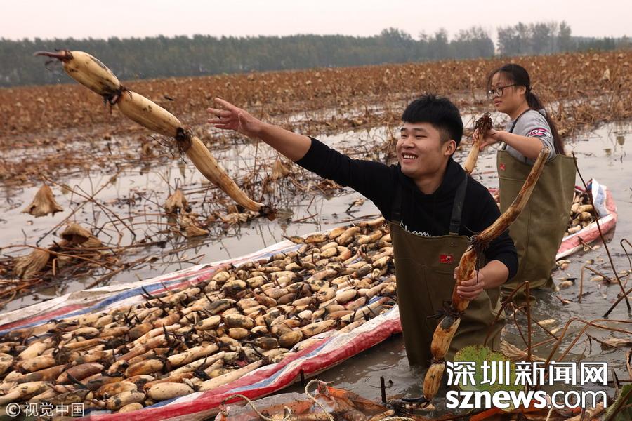 2018年10月14日,江蘇宿遷,泗洪縣曹廟鄉(xiāng)瓦廟村村民在藕蝦共作基地參加挖藕比賽。