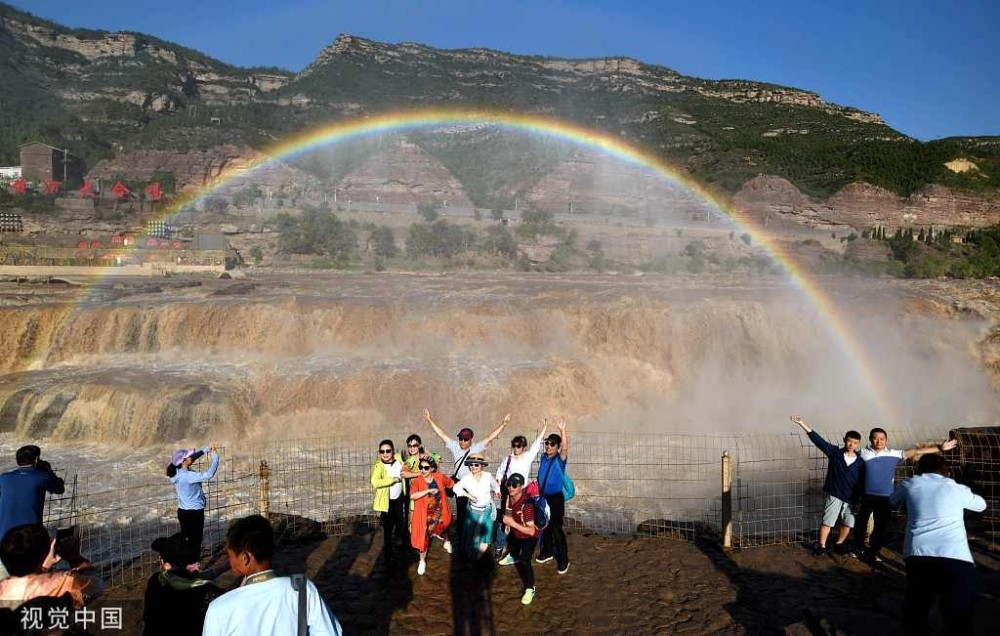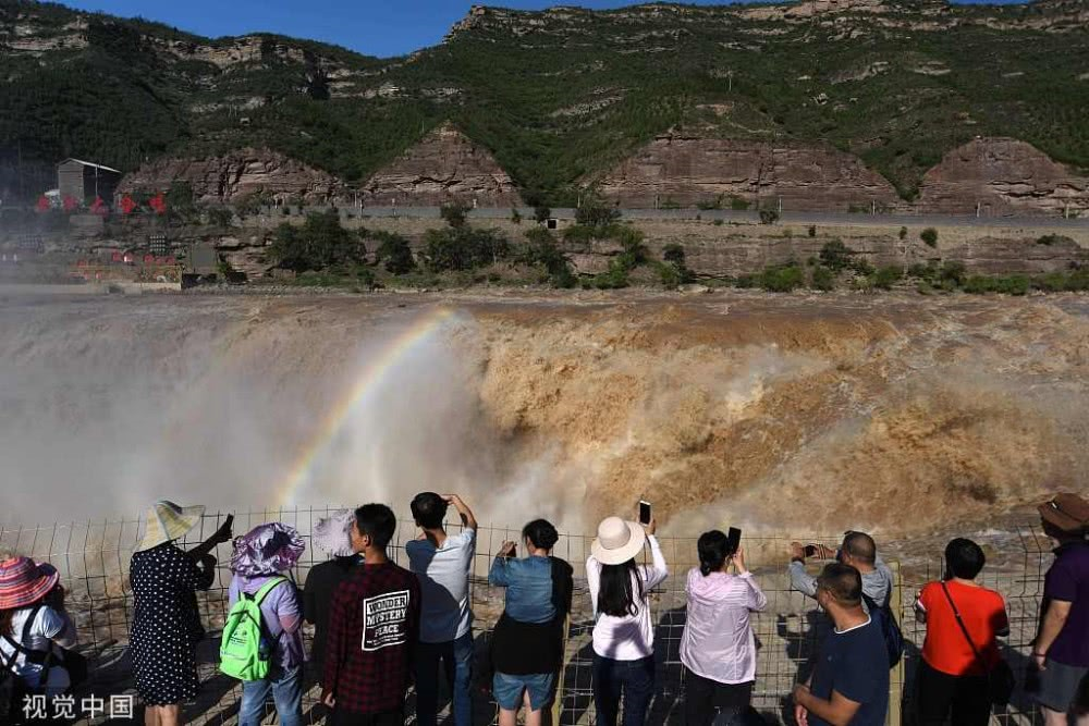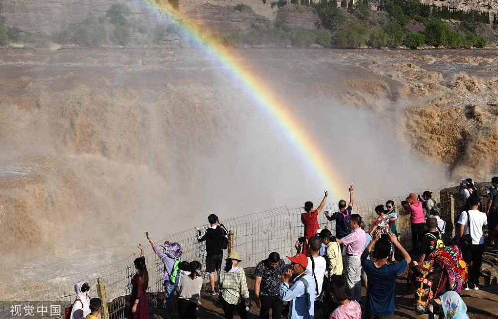 入秋以來(lái),山西吉縣黃河壺口瀑布景區(qū)天氣晴好,黃河干流水量豐沛,壺口瀑布飛濺的浪花和水霧在陽(yáng)光的照射下,形成“彩虹門”景觀,吸引了眾多游客。
