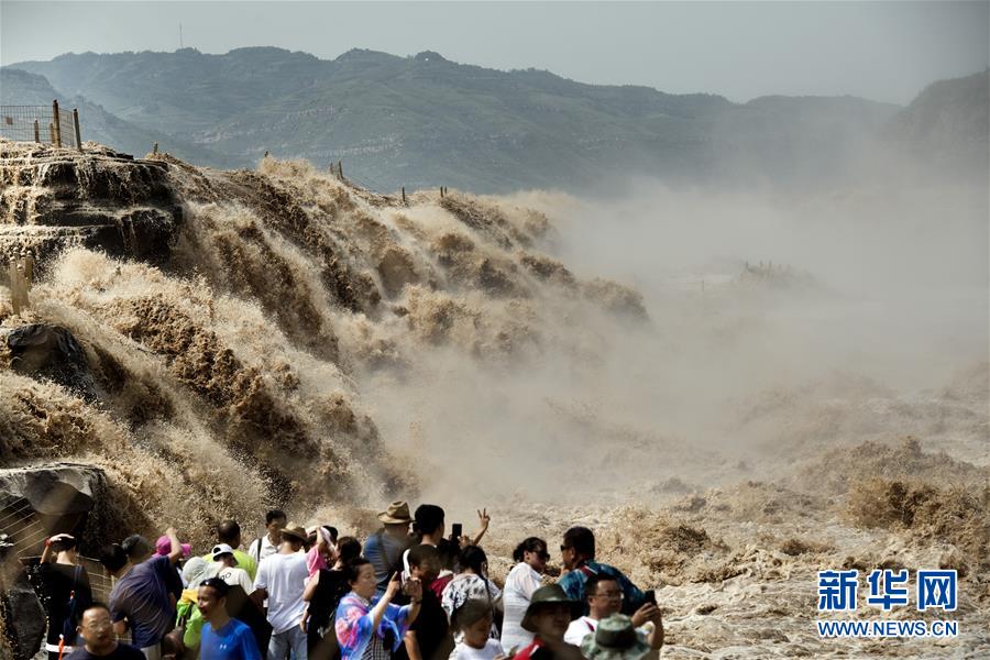 7月19日,游客在陜西境內(nèi)的壺口瀑布群前留影。 新華社記者陶明 攝