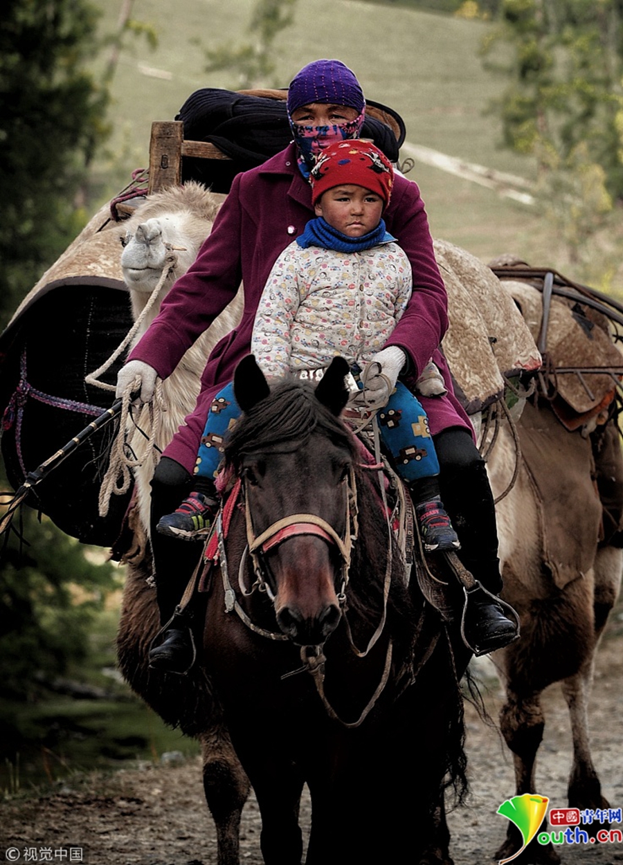 族牧民整理好行裹,抱著孩子,趕著牛羊,浩浩蕩蕩向秋牧場(chǎng)遷徙。