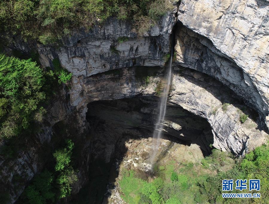 這是在陜西省漢中市寧強(qiáng)縣火石子村用無(wú)人機(jī)拍攝的地洞河天坑內(nèi)的一處瀑布。位于陜西省漢中市寧強(qiáng)縣的地洞河天坑,是禪家?guī)r天坑群中規(guī)模最大的一處天坑,坑內(nèi)分布有石鐘乳、石筍,具有極高的地質(zhì)研究?jī)r(jià)值。新華社 張博文 攝