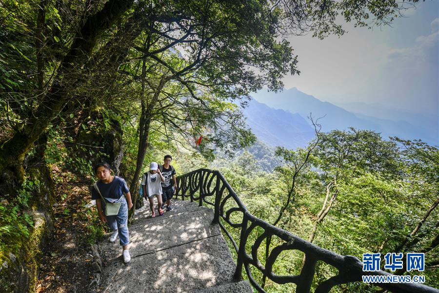 游客在重慶金佛山風(fēng)景區(qū)內(nèi)的絕壁棧道上游覽體驗(yàn)(8月20日攝)。 新華社記者 劉潺 攝