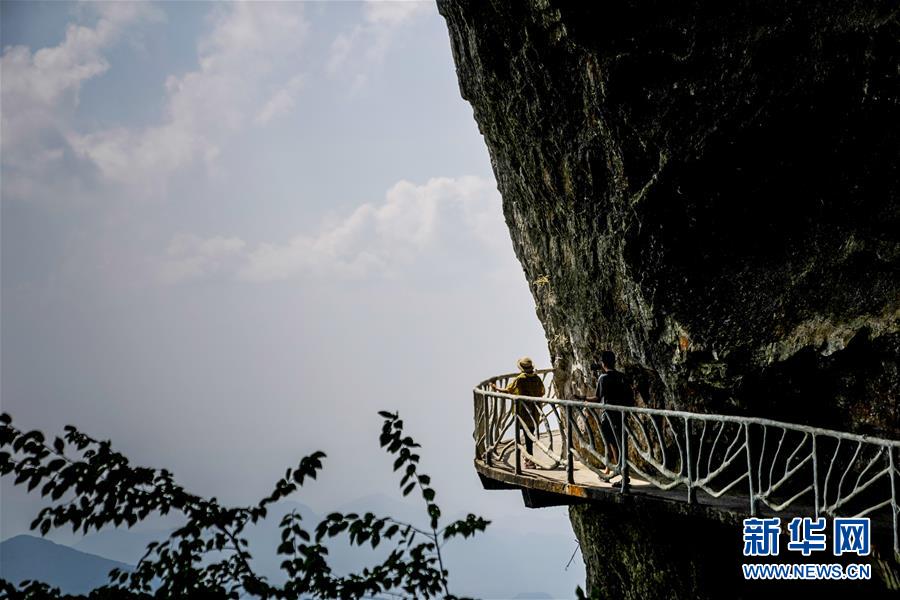 游客在重慶金佛山風景區(qū)內(nèi)的絕壁棧道上游覽體驗(8月20日攝)。 新華社記者 劉潺 攝