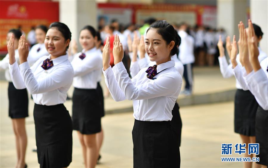 海南省旅游學校禮儀隊的學生在上禮儀課(2018年4月20日攝)。新華社記者郭程攝